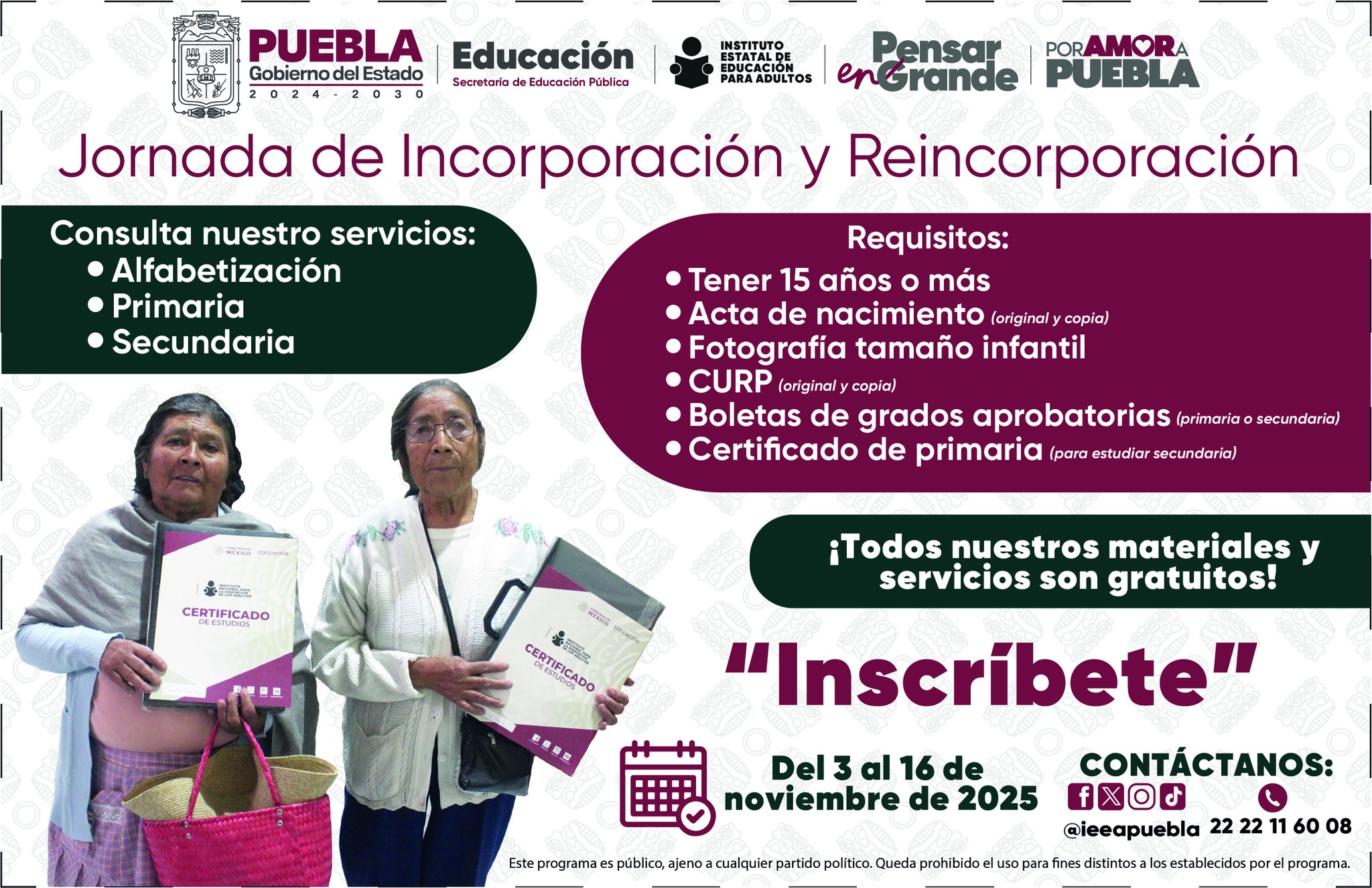 El IEEA Puebla te invita a participar en la Jornada de Incorporación y Reincorporación 2025, del 3 al 16 de noviembre.
