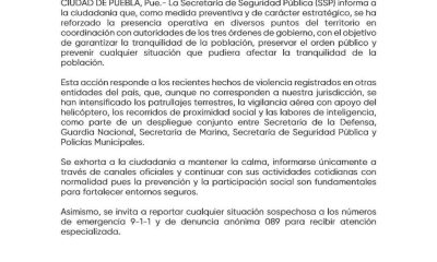 Domingo 22 de febrero de 2026 CIUDAD DE PUEBLA, Pue.- La Secretaría de Seguridad Pública (SSP) informa a la ciudadanía que, como medida preventiva y de...