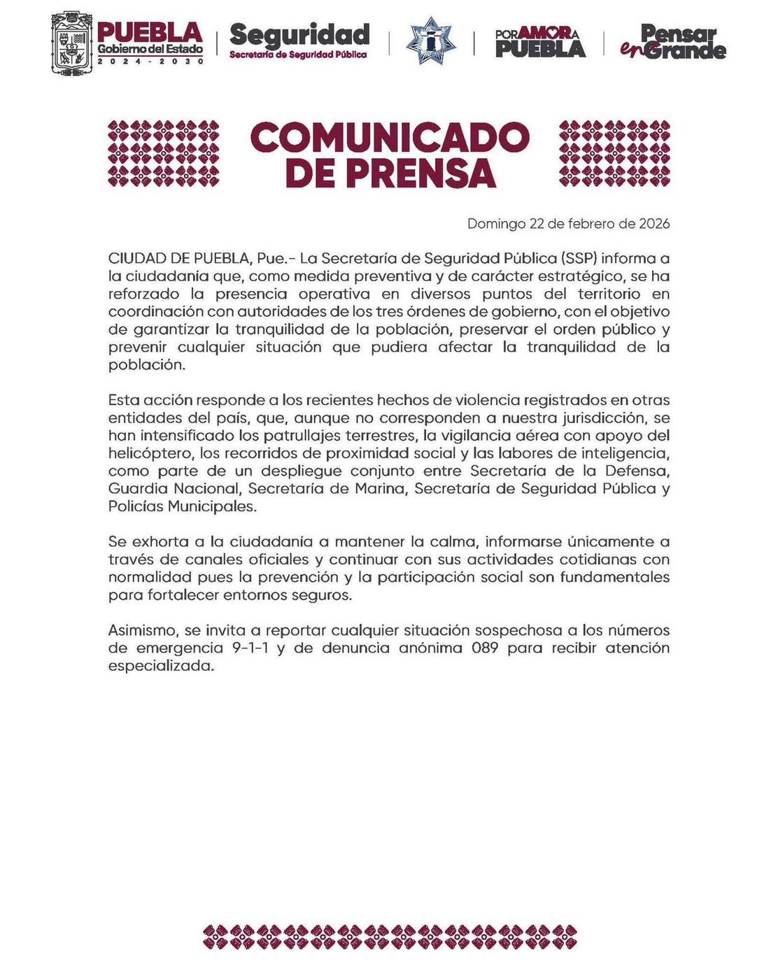 CIUDAD DE PUEBLA, Pue.- La Secretaría de Seguridad Pública (SSP) informa a la ciudadanía que, como medida preventiva y de carácter estratégico, se ha reforzado la presencia operativa en diversos puntos del territorio en coordinación con autoridades de los tres órdenes de gobierno, con el objetivo de garantizar la tranquilidad de la población, preservar el orden público y prevenir cualquier situación que pudiera afectar la tranquilidad de la población.