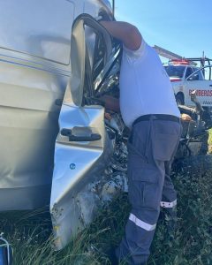 Elementos de Servicios de Emergencia, Bomberos y paramédicos de SUMA laboran en el lugar para realizar la extracción del cuerpo con equipo hidráulico y brindar atención médica a los heridos.
