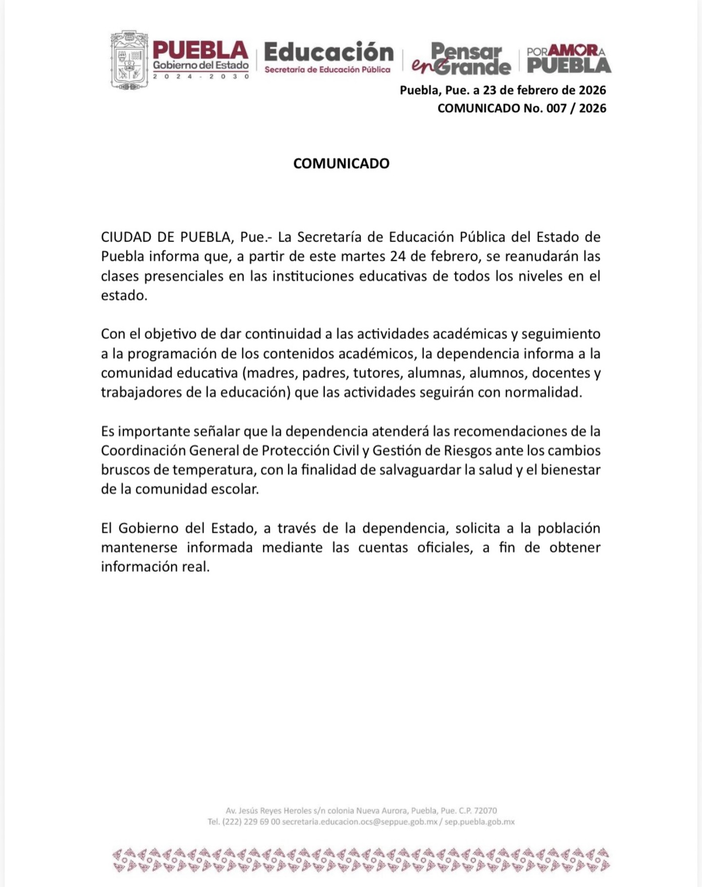 La Secretaría de Educación Pública del Estado de Puebla informa que, a partir de este martes 24 de febrero, se reanudarán las clases presenciales en las instituciones educativas de todos los niveles en el estado.