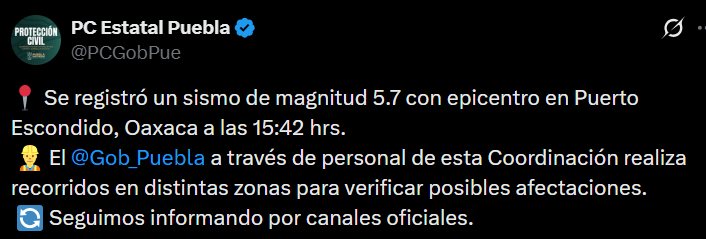 Noticias Se registró un sismo de magnitud 5.7, con epicentro en Puerto Escondido, Oaxaca, a las 15:42 horas. Publicado hace 3 semanas en 8 febrero, 2026 Por ciudadserdan Share Tweet ♂️ El Gobierno del Estado de Puebla, a través de personal de esta Coordinación, realiza recorridos preventivos en distintas zonas para descartar o identificar posibles afectaciones. Temas relacionados Sigue con Monitoreo preventivo | Ciudad Serdán No te pierdas BANDFEST Continuar leyendo Dejar un comentario Deja un comentario Cancelar respuestaTu dirección de correo electrónico no será publicada. Los campos obligatorios están marcados con *Comentario * Nombre * Correo electrónico * Web Guardar mi nombre, correo electrónico y sitio web en este navegador para la próxima vez que haga un comentario. Recientes Noticiashace 6 días INCENDIO EN JARDÍN DE NIÑOS EN CIUDAD SERDÁN FUE CONTROLADO Educaciónhace 1 semana Desde el ITSCdSerdán, traemos para ti Radio Tec Sin categoríahace 1 semana ️ En entrevista con Maximino Angulo Marín, Coordinador de CORDE XV CAMPOhace 1 semana ⛰️ El campo fuerte y unido en Texmalaquilla Culturahace 1 semana Historia Viva que Inspira y Une ✨